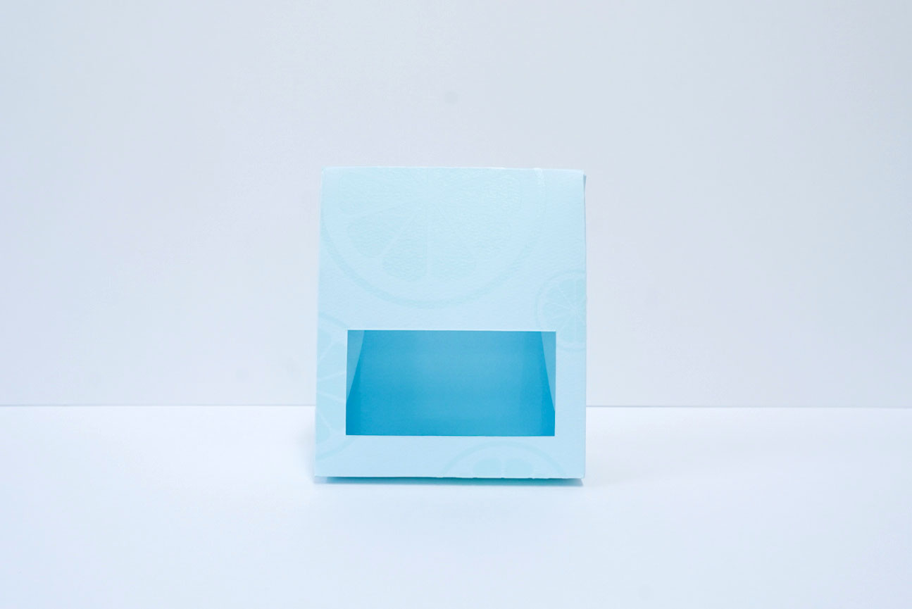 やっこ型とも呼ばれる四方から商品を包むような形状のパッケージです。厚みのないものによく用いられます。テープ止めが1カ所となりますので、作業効率もあがります。